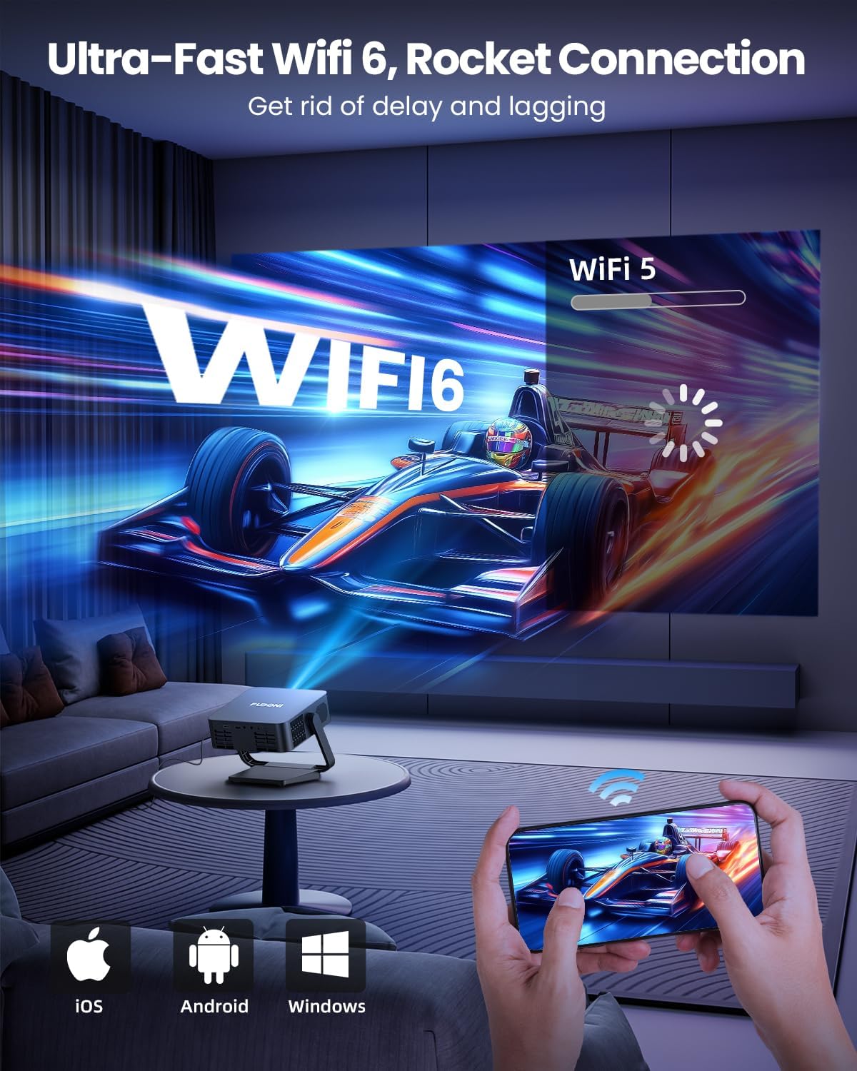 - Dual-Band WiFi & Two-Way Bluetooth, Faster and Stable: FUDONI projector with wifi and bluetooth offers a robust and versatile connectivity experience with rocket speeds, and improved audio quality with dual-band WiFi 6; Projector also supports two-way Bluetooth, audio transmission, allowing connection to mobile devices, speaker or other bluetooth equippment to enhance audio effects for home projectors anytime and anywhere.